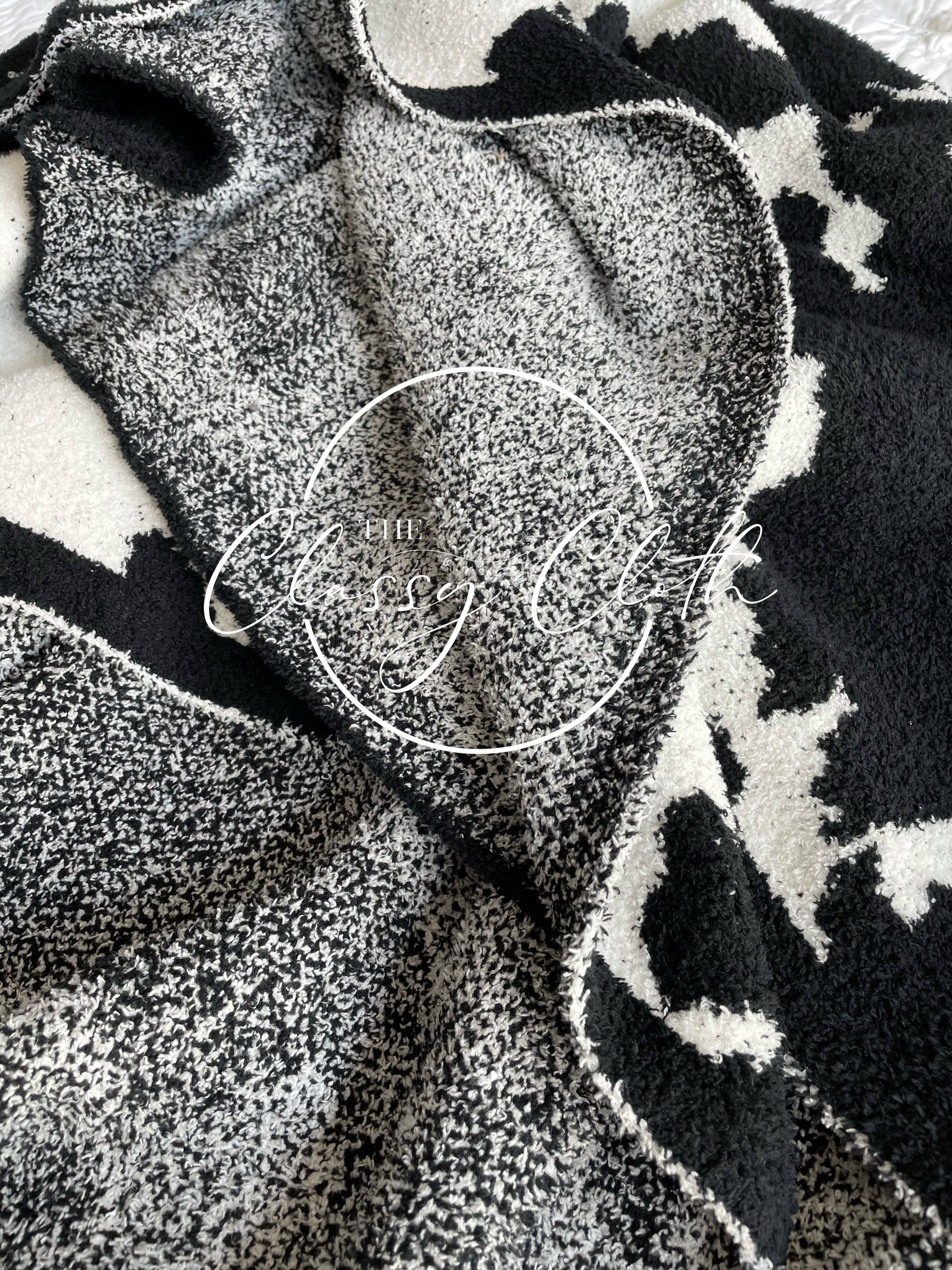 Indulge in cozy western-inspired comfort with our Luxe Jacquard Blanket in Black Cow. Exceptionally soft, thick, and stretchy, this luxe blanket drapes beautifully over sofas, beds, and accent chairs, adding warmth and texture to any space. The bold black and ivory cowhide pattern delivers a modern western look that performs especially well for fall décor, ranch-style homes, and lodge-inspired interiors.