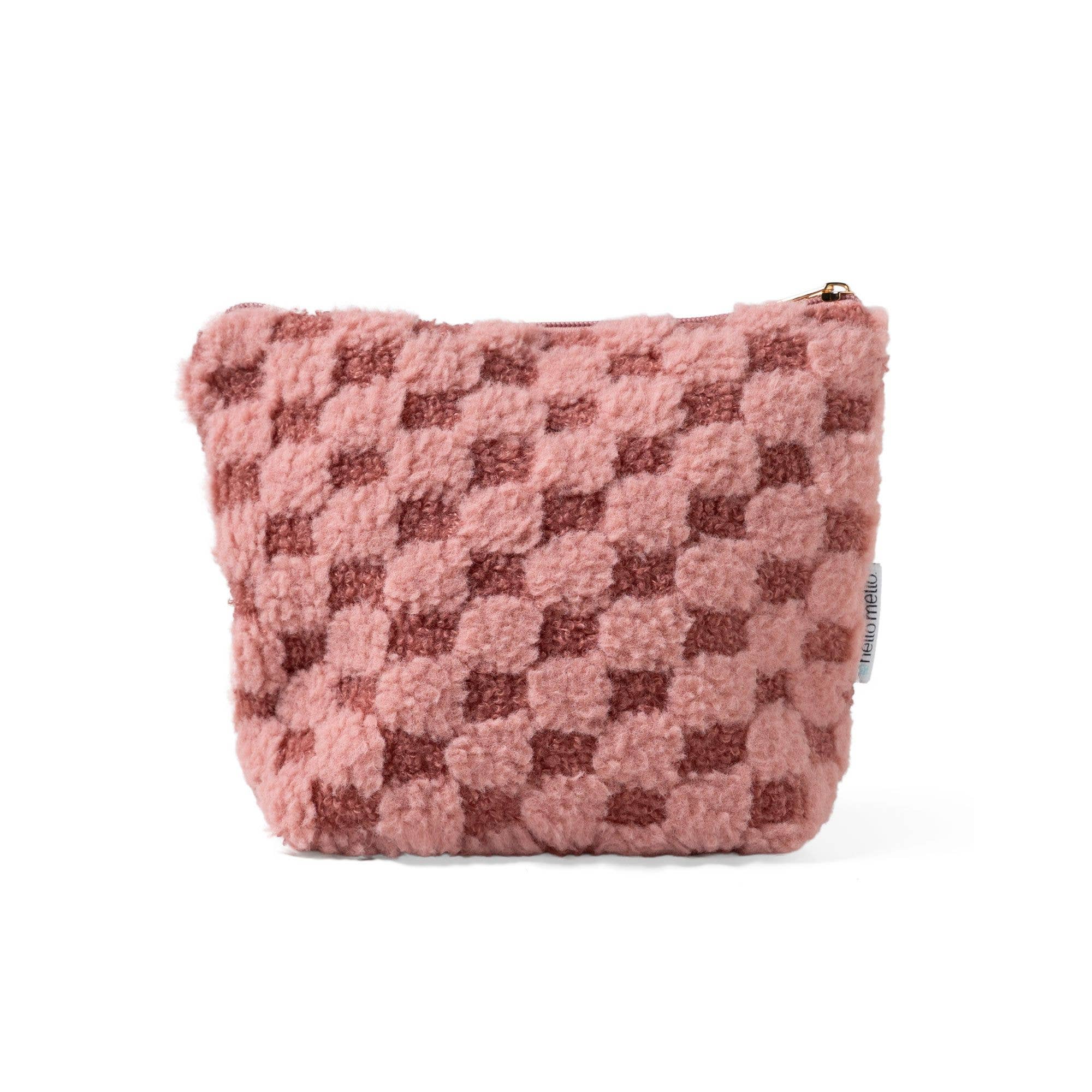 Designed in three fluffy checkerboard patterns, this zippered bag is a cozy catch-all for makeup, tech, travel and overnight essentials.