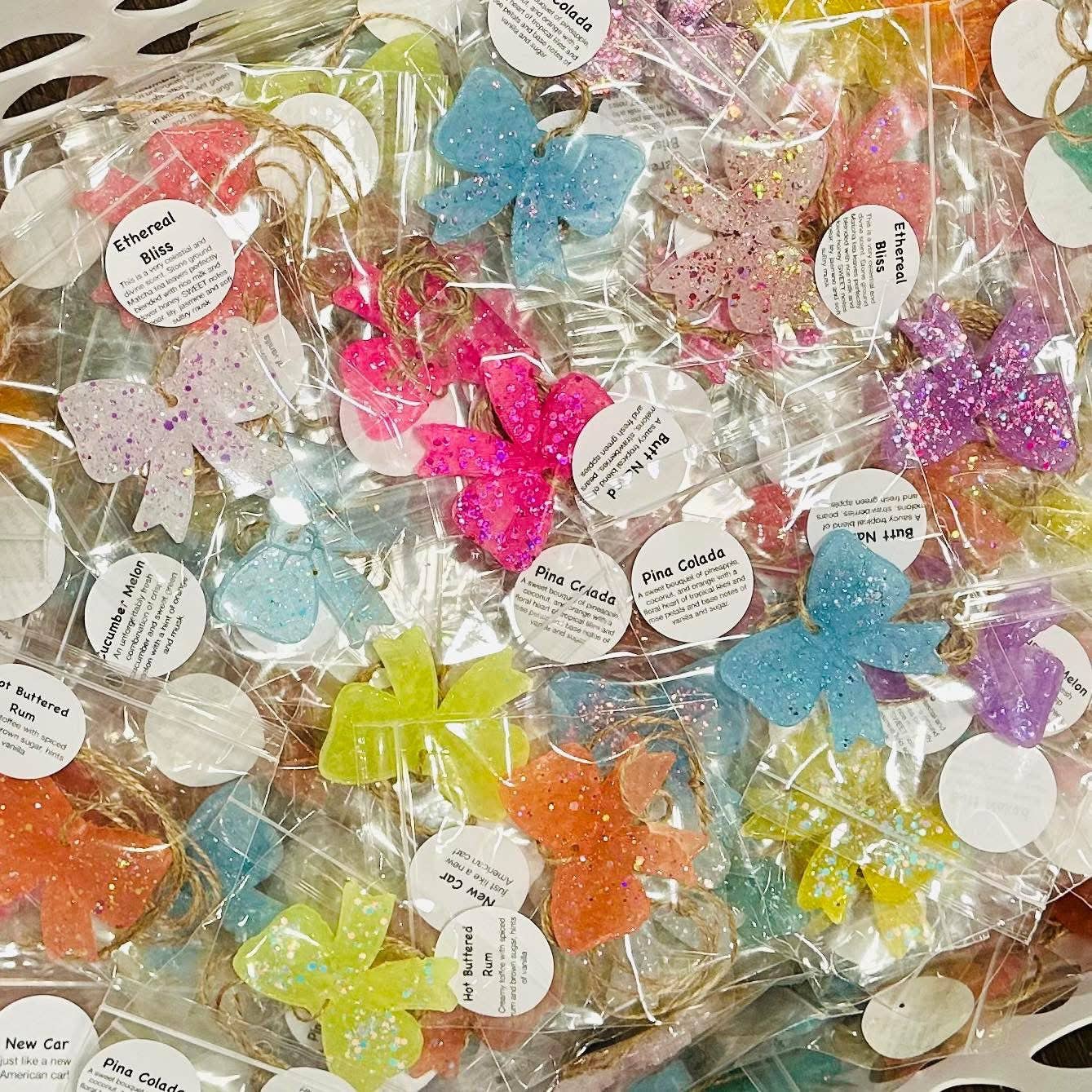 Perfect for rearview mirrors, small spaces, or gifting, these mini bow freshies add a pop of seasonal style while delivering long-lasting fragrance.